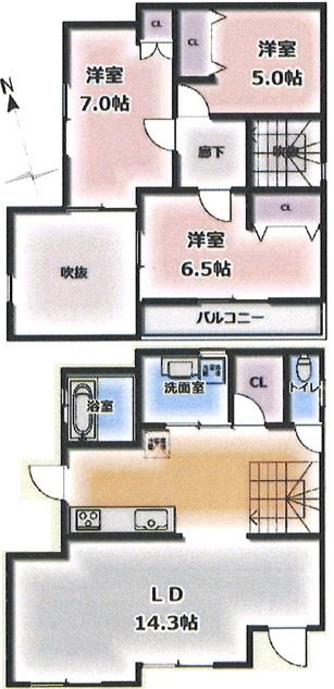 | 間取詳細 | (1F)LDK14.3、(2F)洋5.0、(2F)洋6.5、(2F)洋7.0 |