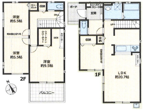 | 間取詳細 | (1F)LDK20.7、(2F)洋5.5、(2F)洋5.5、(2F)洋9.5 |