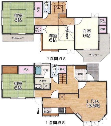 | 間取詳細 | (1F)LDK13.6、(1F)和6.0、(2F)和8.0、(2F)洋6.0、(2F)洋6.0 |