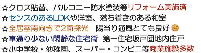 | 特色 | 駐車場、南道路、公営水道、公共本下水、都市ガス、リフォーム済、境界非明示、現況渡し |