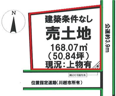 | 特色 | 建築条件なし、角地、南道路、公営水道、公共本下水、プロパンガス、上物有、確定測量(売主負担)、更地渡し |