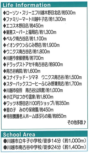 | 学区 | 川越市立牛子小学校 1,000m/川越市立南古谷中学校 1,400m |