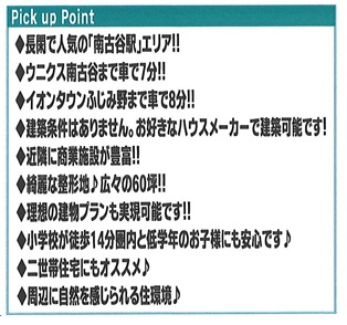 | 特色 | 建築条件なし、南道路、公営水道、公共本下水、プロパンガス、更地、現況有姿 |