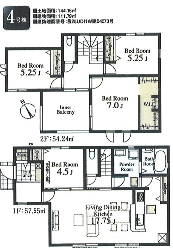 | 間取詳細 | (1F)LDK17.75、(1F)洋4.5、(2F)洋5.25、(2F)洋5.25、(2F)洋7.0 |
