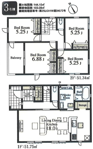 | 間取詳細 | (1F)LDK18.0、(2F)洋5.25、(2F)洋5.25、(2F)洋5.25、(2F)洋6.88 |