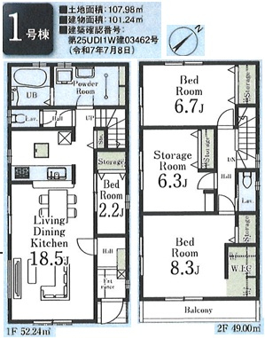 | 間取詳細 | (1F)LDK18.5、(2F)洋6.3、(2F)洋6.7、(2F)洋8.3 |