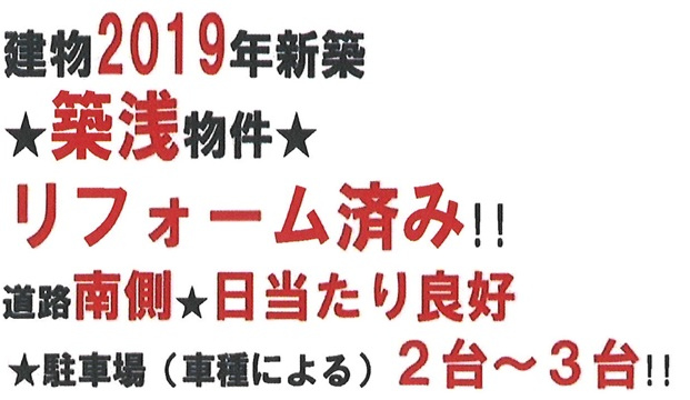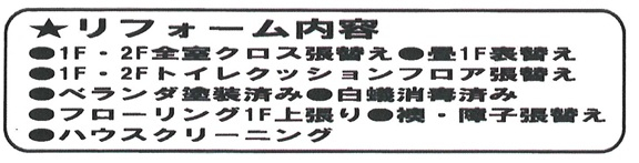 | 特色 | 駐車場、南道路、公営水道、公共本下水、プロパンガス、司法書士(売主指定)、火災保険(売主指定)、リフォーム済、空家 |