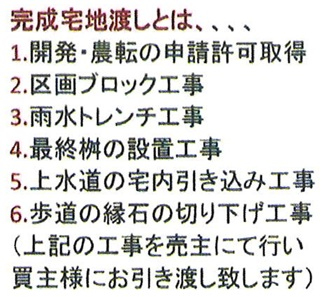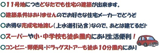 | 特色 | 建築条件なし、調整34条11号、公営水道、個別浄化槽、側溝、プロパンガス、農地転用・開発許可が必要です(売主負担)、完成宅地での引渡し |