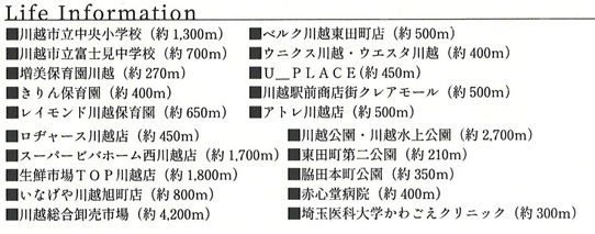 | 学区 | 川越市立中央小学校 1,300m/川越市立富士見中学校 700m |