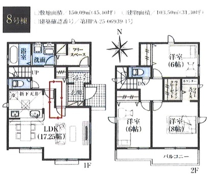 | 間取詳細 | (1F)LDK17.25、(2F)洋6.0、(2F)洋6.0、(2F)洋8.0 |