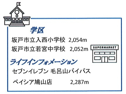 | 学区 | 坂戸市立入西小学校 2,054m/坂戸市立若宮中学校 2,052m |