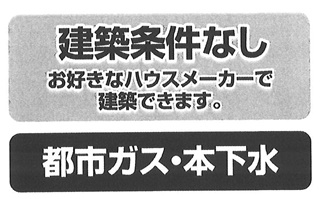 | 特色 | 建築条件なし、南道路、公営水道、公共本下水、都市ガス、平屋か2階建てのみ建築可能、更地 |