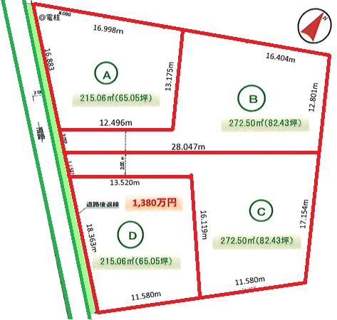 | 特色 | 建築条件なし、調整34条12号、公営水道、公共本下水(分担金は買主負担)、都市ガス、農地転用・開発許可が必要です(売主負担)、完成宅地の引渡し |