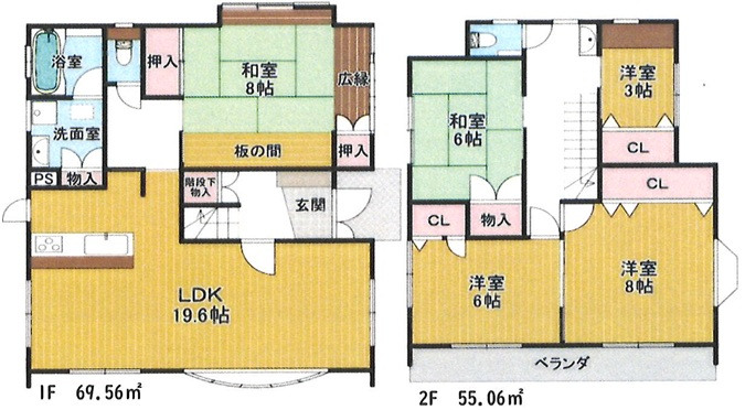 | 間取詳細 | (1F)LDK19.6、(1F)和8.0、(2F)和6.0、(2F)洋3.0、(2F)洋6.0、(2F)洋8.0 |