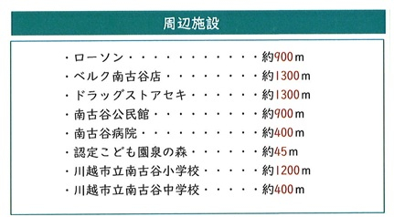 | 学区 | 川越市立南古谷小学校 1,200m/川越市立南古谷中学校 400m |