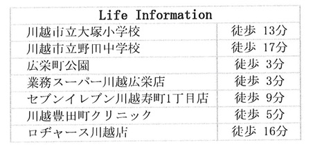 | 学区 | 川越市立大塚小学校 900m/川越市立大東中学校 1,400m |