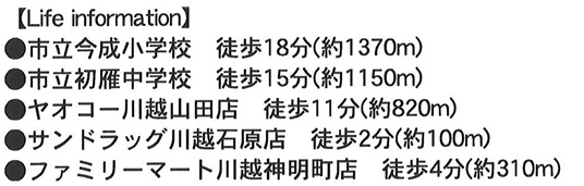 | 学区 | 川越市立今成小学校 1,370m/川越市立初雁中学校 1,150m |