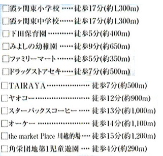 | 学区 | 川越市立霞ヶ関東小学校 1,300m/川越市立霞ヶ関東中学校 1,300m |
