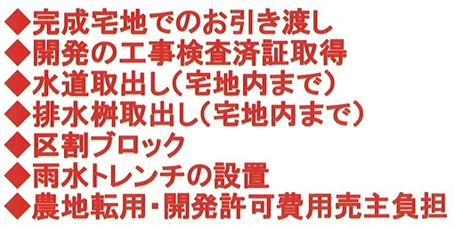 | 特色 | 建築条件なし、調整34条12号、公営水道、個別浄化槽(排水先組合承諾要)、プロパンガス、農地転用・開発許可が必要です、完成宅地での引渡し |