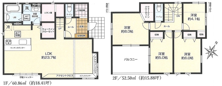 | 間取詳細 | (1F)LDK23.7、(2F)洋4.1、(2F)洋5.0、(2F)洋6.0、(2F)洋8.0 |