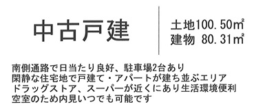 | 特色 | 駐車場、南道路、公営水道、公共本下水、都市ガス、空家、現況有姿 |