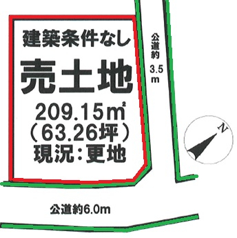 | 特色 | 建築条件なし、角地、南道路、公営水道、公共本下水、プロパンガス、更地、現況渡し |