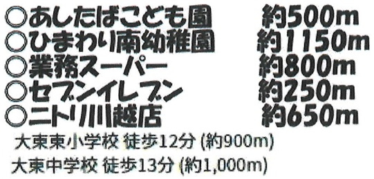 | 学区 | 川越市立大東東小学校 900m/川越市立大東中学校 1,000m |
