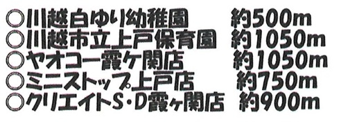 | 学区 | 川越市立上戸小学校 1,000m/川越市立鯨井中学校 1,300m |