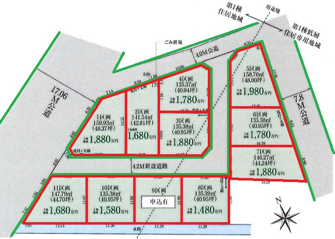 | 接道 | 東 7.8m(幅員) 公道 9.6m(接面) 西 4.2m(幅員) 開発道路 9.1m(接面) |