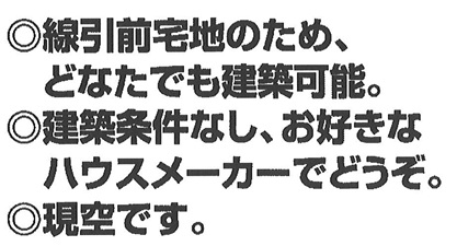 | 特色 | 建築条件なし、調整(線引前宅地)、公営水道、公共本下水、プロパンガス、上物有、セットバック約9㎡(売主負担) |