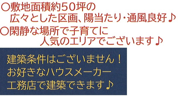 | 特色 | 建築条件なし、公営水道、公共本下水、都市ガス、更地渡し、司法書士(売主指定) |