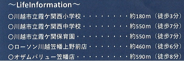 | 学区 | 川越市立霞ヶ関西小学校 180m/川越市立霞ヶ関西中学校 550m |