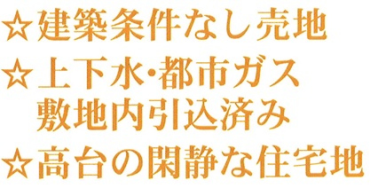 | 特色 | 建築条件なし、公営水道、公共本下水、都市ガス、更地、司法書士(売主指定) |