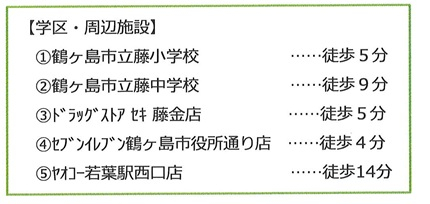 | 学区 | 鶴ヶ島市立藤小学校 400m/鶴ヶ島市立藤中学校 650m |