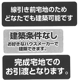 | 特色 | 建築条件なし、調整(線引き前宅地)、南道路、公営水道、個別浄化槽、都市ガス、開発許可が必要です(売主負担)、完成宅地での引渡し |