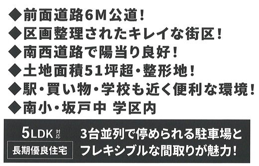 駐車場、駐車スペース3台以上、南道路、公営水道、公共本下水、都市ガス、関間4丁目地区地区計画有(D地区)、池ノ台遺跡包蔵地内、農地法5条の届出要