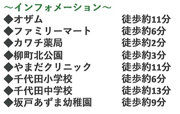 | 学区 | 小学校区:坂戸市立千代田小学校 400m 中学校区:坂戸市立千代田中学校 900m |