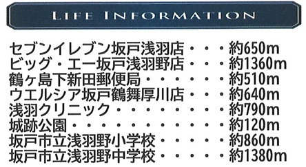 | 学区 | 小学校区:坂戸市立浅羽野小学校 860m 中学校区:坂戸市立浅羽野中学校 1,380m |