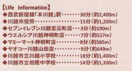 | 学区 | 小学校区:川越市立川越小学校 1,400m 中学校区:川越市立初雁中学校 1,100m |