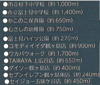 | 学区 | 小学校区:鶴ヶ島市立杉下小学校 1,000m 中学校区:鶴ヶ島市立富士見中学校 1,400m |