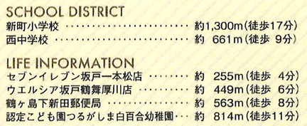 | 学区 | 小学校区:鶴ヶ島市立新町小学校 1,300m 中学校区:鶴ヶ島市立西中学校 661m |