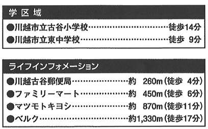 | 学区 | 小学校区:川越市立古谷小学校 1,100m 中学校区:川越市立東中学校 650m |