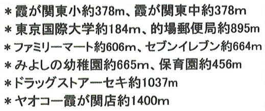 | 学区 | 小学校区:川越市立霞ヶ関東小学校 378m 中学校区:川越市立霞ヶ関東中学校 378m |