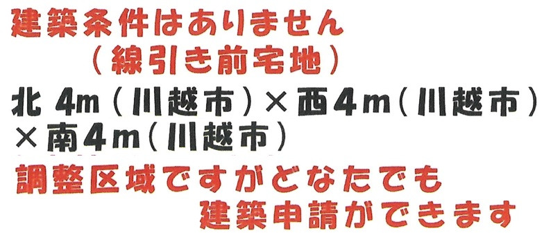 建築条件なし、調整(線引前宅地)、角地、南道路、公営水道、個別浄化槽、側溝、プロパンガス、更地渡し、埋蔵文化財包蔵地内