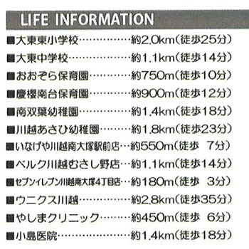 | 学区 | 小学校区:川越市立大東東小学校 2,000m 中学校区:川越市立大東中学校 1,100m |