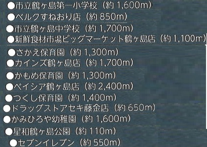 | 学区 | 小学校区:鶴ヶ島市立鶴ヶ島第一小学校 1,600m 中学校区:鶴ヶ島市立鶴ヶ島中学校 1,700m |