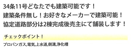 建築条件なし、調整34条11号、南道路、公営水道、個別浄化槽、プロパンガス、更地渡し、開発許可が必要です(買主負担)、建物完成後に協定道路舗装(売主負担)