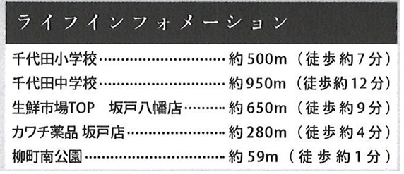 | 学区 | 小学校区:坂戸市立千代田小学校 500m 中学校区:坂戸市立千代田中学校 950m |
